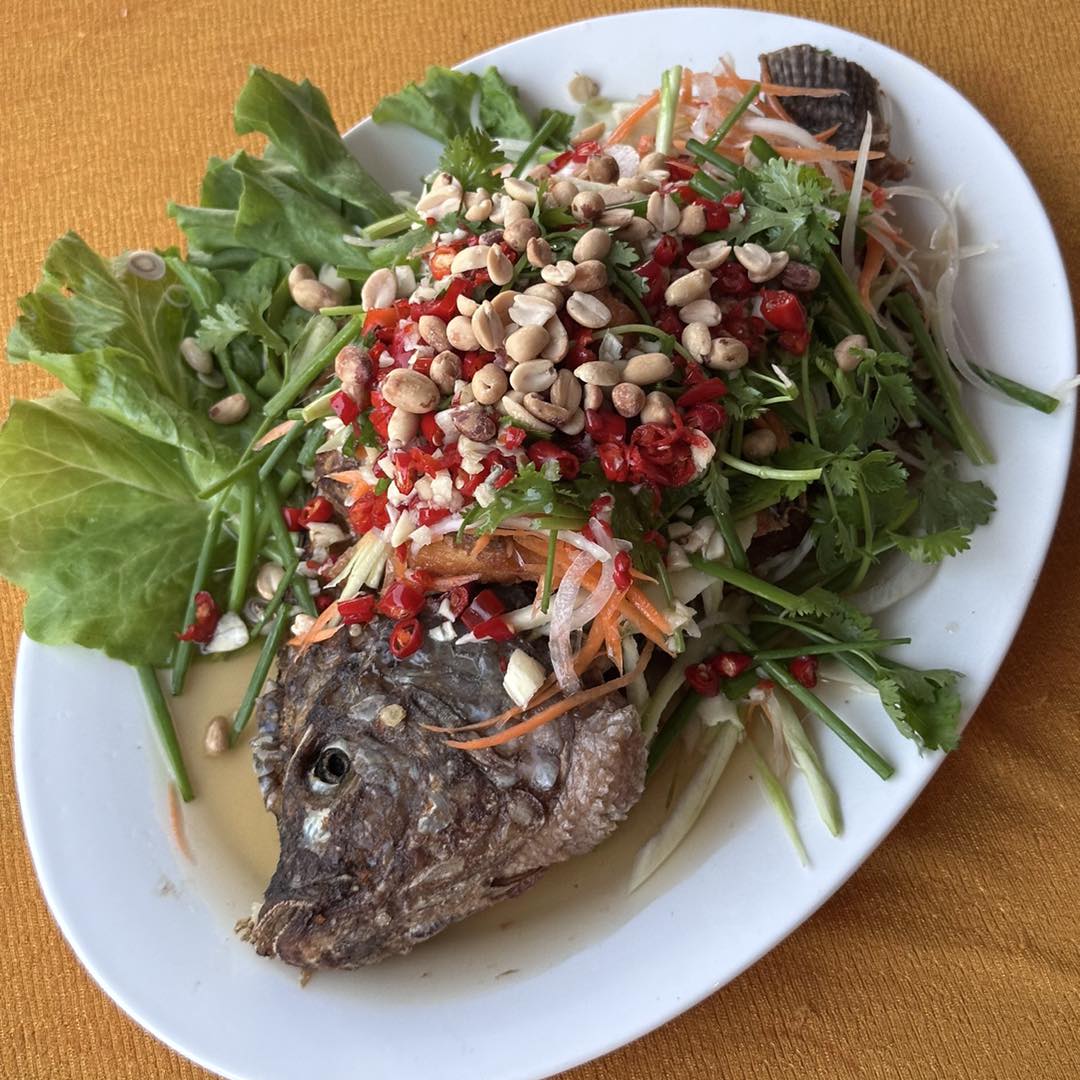 Ingrédients : poisson (souvent tilapia ou poisson-chat), citronnelle, feuilles de lime, ail, échalotes, piment, pâte de poisson (padaek).