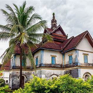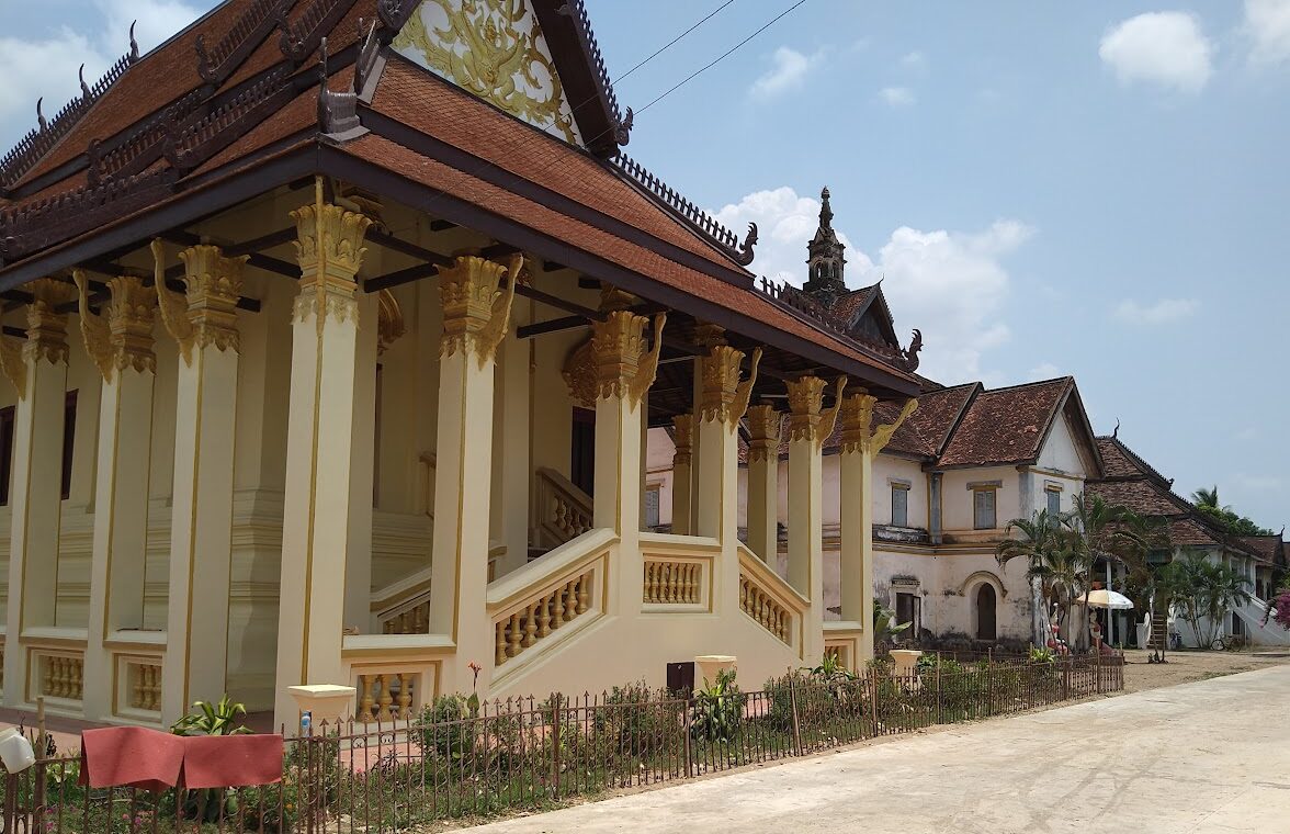 Situé à environ 5 km au sud de Champasak, le Wat Muang Kang est un lieu de culte actif, offrant une atmosphère paisible et une architecture unique. L’ubosot (salle d’ordination) présente un toit en tuiles rouges et une série de piliers, typiques du style thaïlandais. La hǎw tąi (bibliothèque Tripitaka) est particulièrement remarquable, combinant des éléments de design laotien, chinois, vietnamien et colonial français.